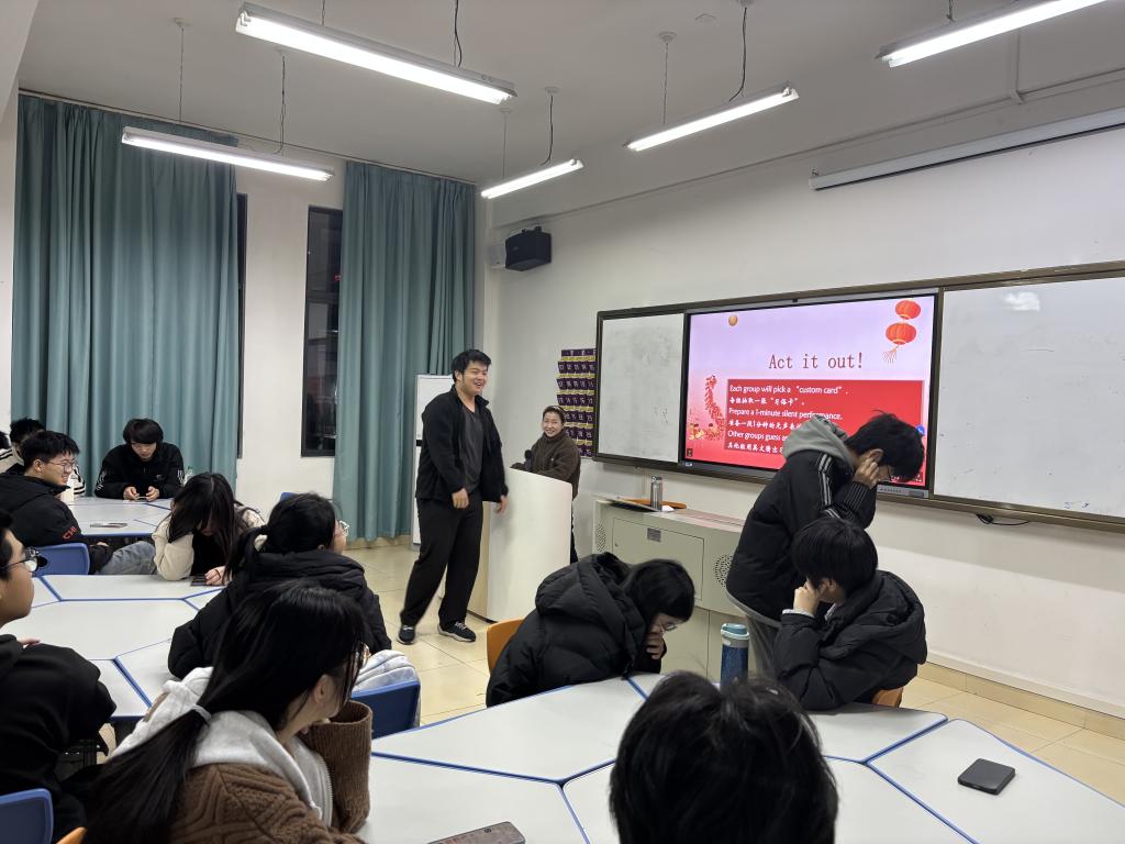 在“传统习俗”环节,张银老师介绍了扫尘、守岁等习俗的文化寓意,并组织开展了你画我猜游戏。各小组抽取写有习俗的卡片,用一分钟无声表演进行展示,其他小组用英语竞猜习俗名称,现场互动热烈,笑声不断。