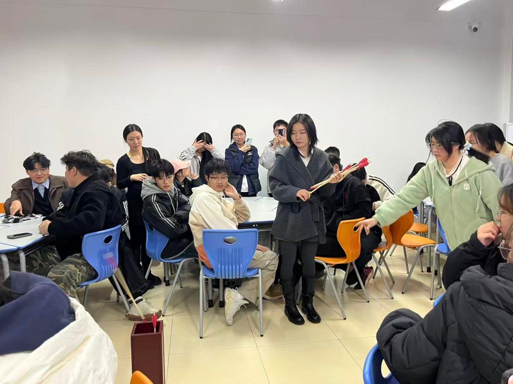 活动后半程聚焦“中国传统体育的智慧与传承”。尹莹老师通过PPT展示蹴鞠(Cuju)、投壶(Touhu)、击鞠(Jiju)等历史图片与英文简介。学生从中不仅加深了对这些传统运动规则与文化意义的理解,更体会到了我们的传统体育运动对现代运动的深远影响。接着展开了实践体验环节,老师们拿出了提前准备好的投壶道具,邀请学生分组体验。学生们站在指定距离处,尝试将箭投入壶中,同时用英语描述动作与感受。不少学生初次投壶时尝试兴奋不已,现场掌声与欢呼声不断,传统体育的魅力在实践中深入人心。最后,活动积分最高的两组获得了小奖励。